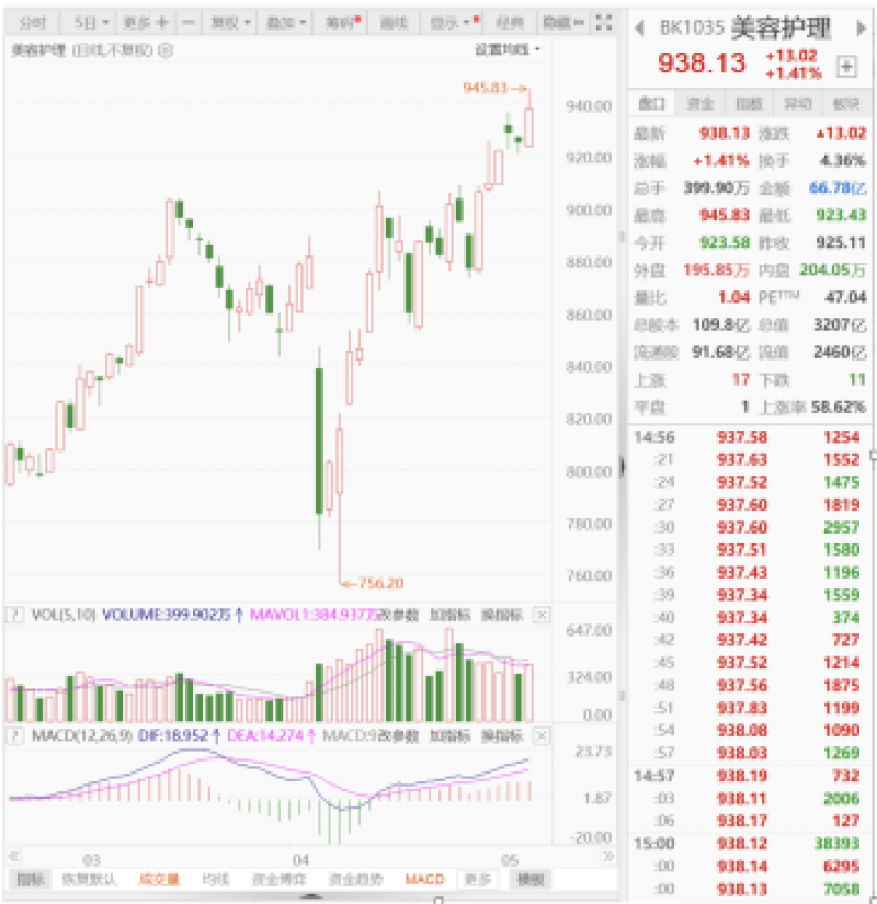 在清明节假期之后刚开市,“美容护理”板块同样受到了外围环境影响而大幅下挫。根据“美容护理”(BK1035)板块指数,4月上旬最低跌至756.20点。但是,经过大约一个月的时间,该板块不断走强,在5月9日板块指数创新高,最高触及945.83点。